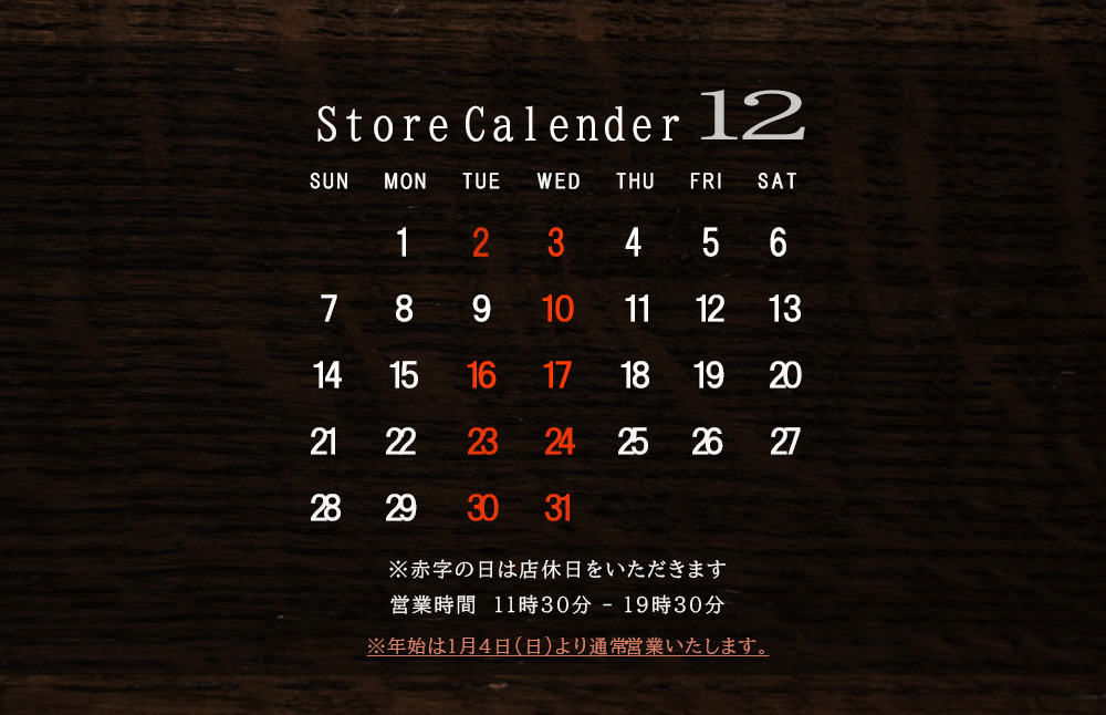年内は12月29日(月)まで。年始は1月4日(日)より営業いたします。