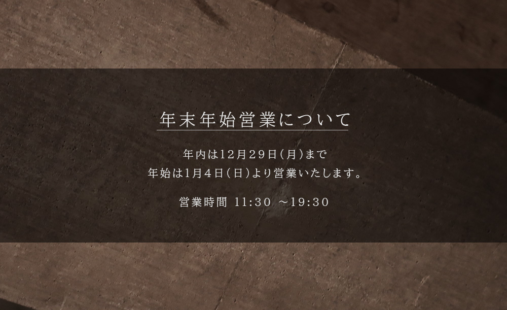 12月29日(月)PM2:00以降のご注文、お問い合わせに関しましては、1月4日(日)より順次対応させていただきます。
