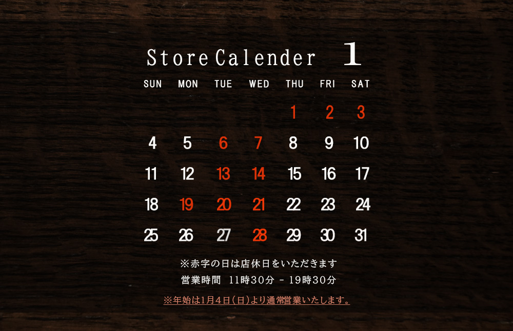 当店は毎週水曜日に定休日をいただいておりますが、2025年1月は画像赤字の曜日も合わせて店休日とさせていただきます。