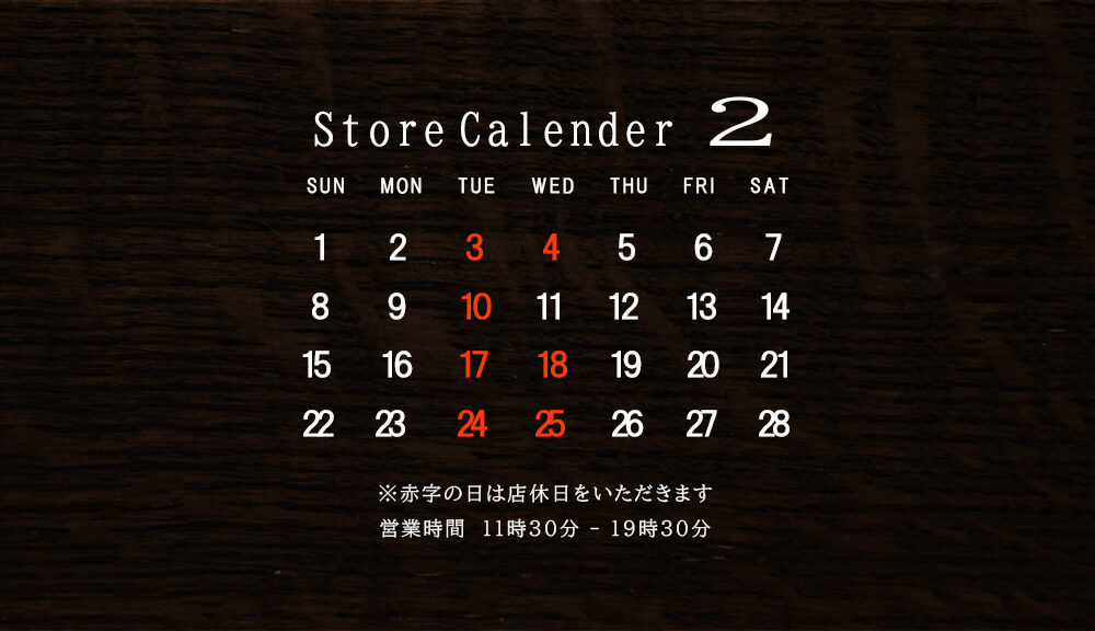 2026年2月は画像赤字の曜日を店休日とさせていただきます。