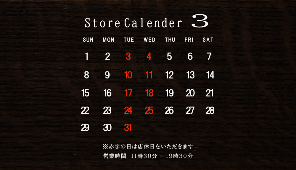 2026年3月は画像赤字の日程で店休日とさせていただきます。